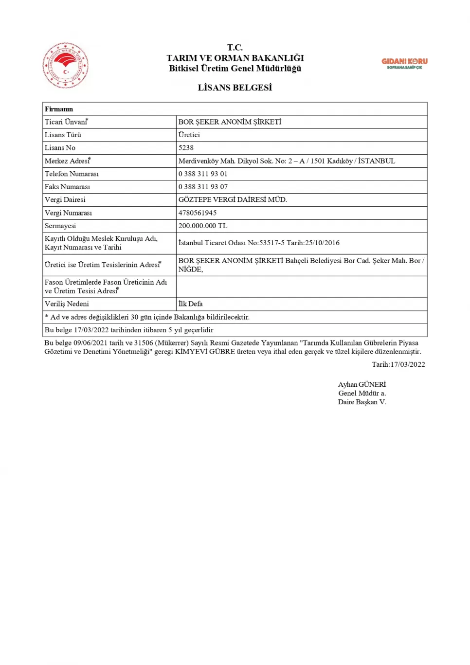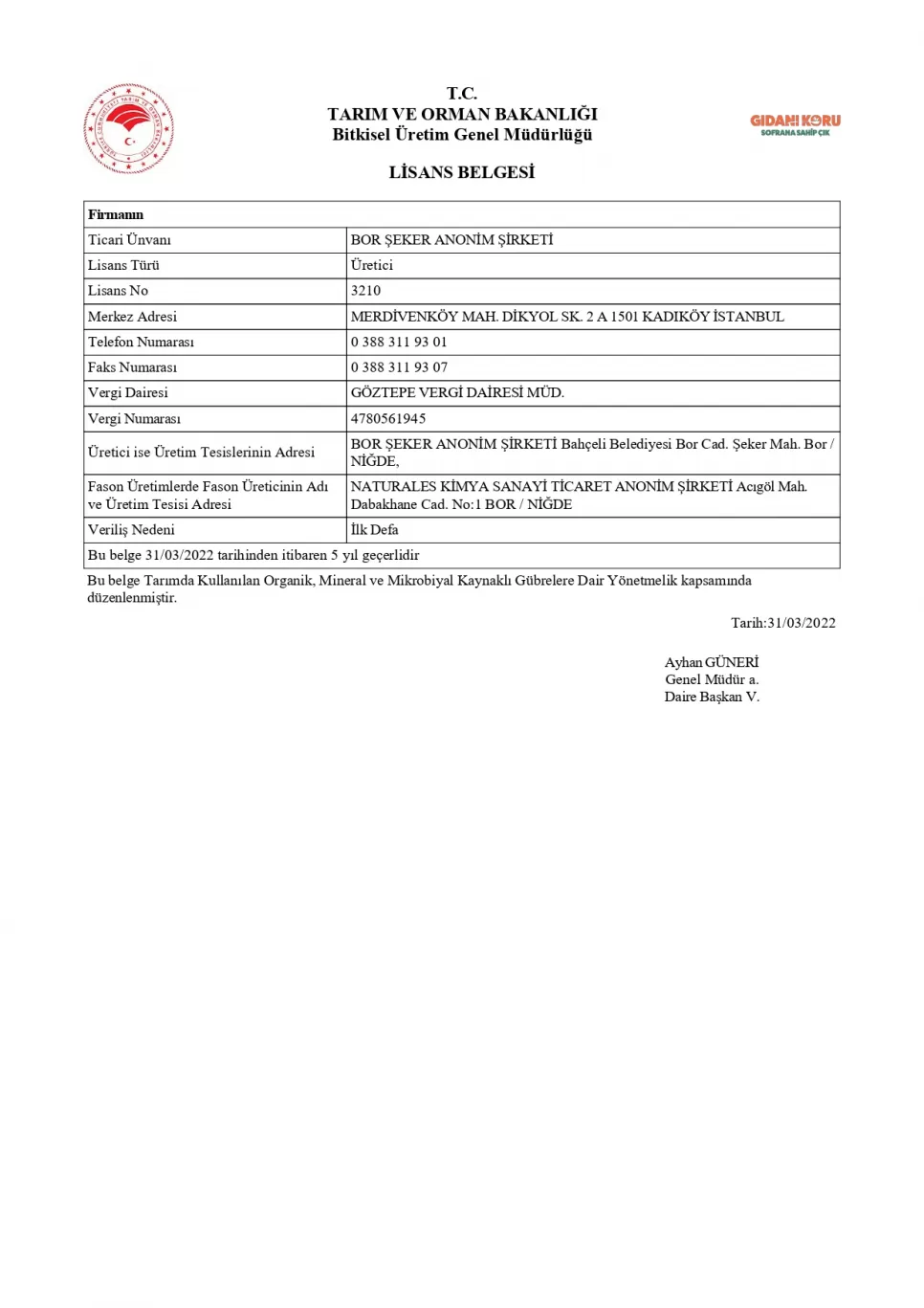 Kimyevi Gübre Lisans Belgesi